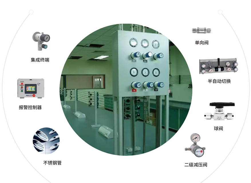 采用集中供氣形式,氣瓶室房間內(nèi)安裝泄露報警裝置并且連動緊急排風,避免危險發(fā)生